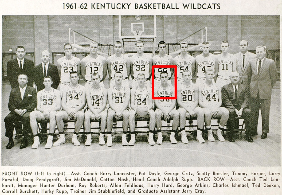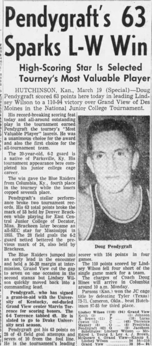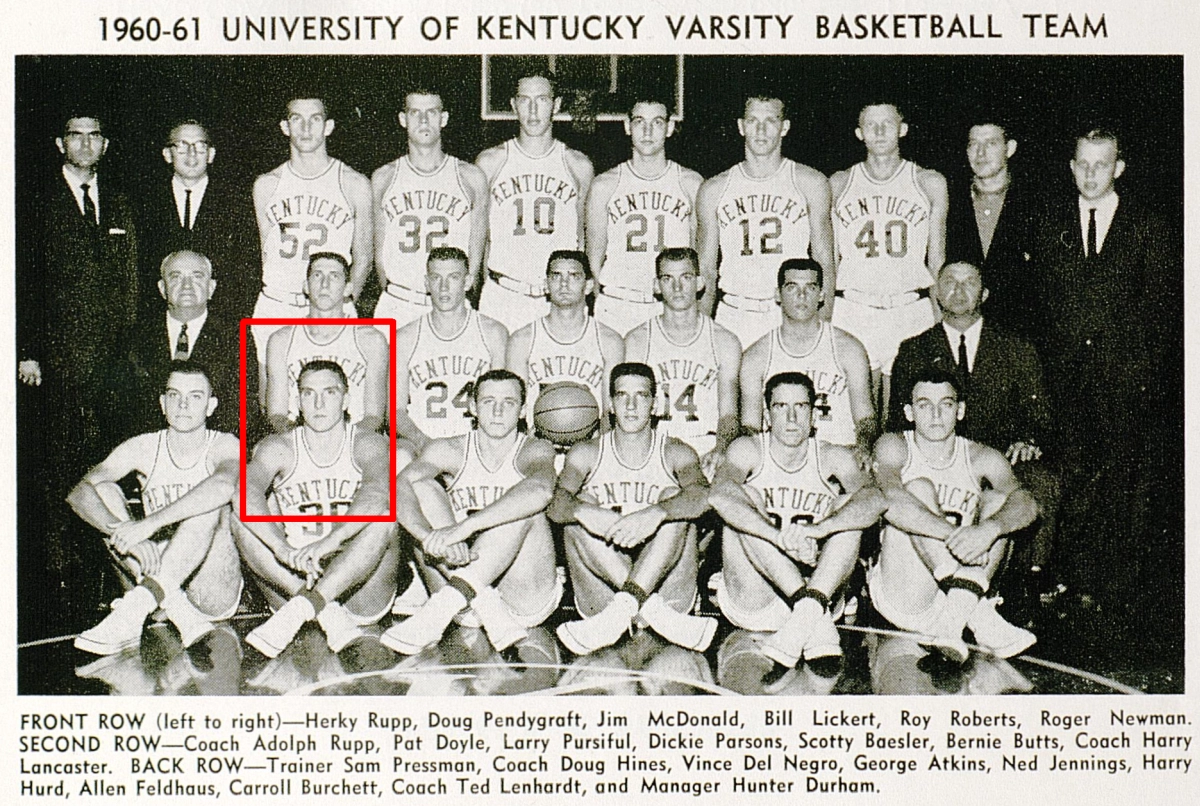 The 6-2 native Kentuckian from Parksville, spent his first two collegiate years at Lindsey Wilson Junior College of Columbia, Kentucky. During the 1959-60 campaign, Pendygraft developed into one of the nation’s top JC cagers. He set all kinds of junior college scoring records, won unanimous selection as the “Most Valuable Player” in the 1960 JC national tourney, and attained JC All-America honors. He was the leading scorer of the tournament with 154 points in four games and eclipsed by 10 points the previous one-game tourney high with a 63-point outburst as he paced the Lindsey-Wilson Blue Raiders over Grand View (Iowa) in the fourth-place game. He became the third winner of the JC “MVP” award to attend UK. Previous recipients who became Wildcats were Sid Cohen and Bob Burrow. Pendygraft’s final season scoring average of 25.7 slotted him just behind Del Negro in junior college ranks.