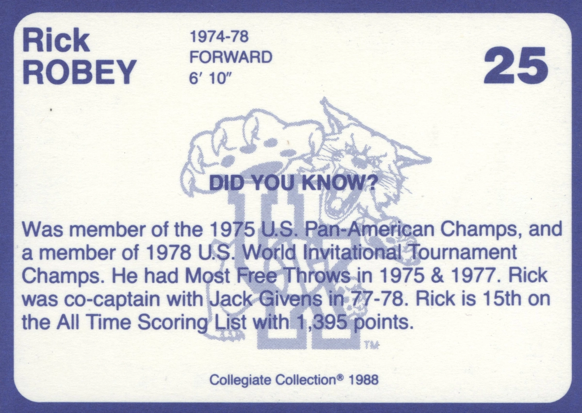 Robey was a member of UK’s 1974–1975 team that was the 1975 NCAA Championship Runner Up and UK’s 1977–1978 team that won the 1978 NCAA Championship.