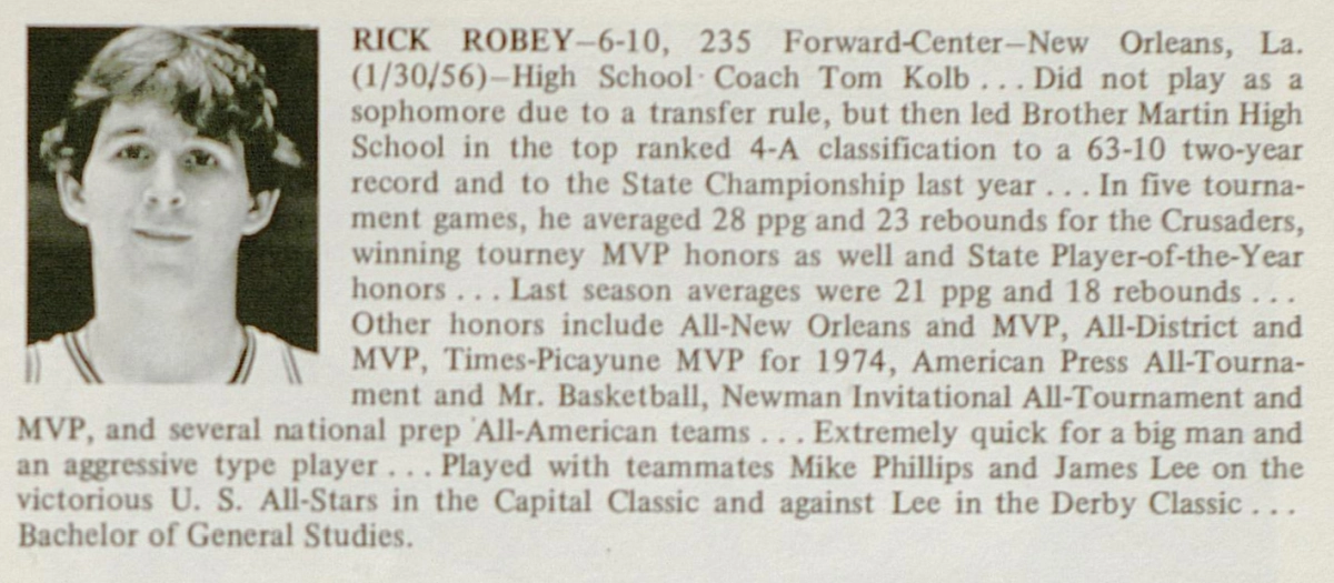 Robey was chosen as one of 1974’s “30 hottest college prospects” by five well-regarded college basketball coaches. Coaches Gene Bartow of Memphis State, Don Haskins of the University of Texas at El Paso, Dick “Digger” Phelps of Notre Dame, George Raveling of Washington State, and Norm Sloan of North Carolina State selected Robey as one of the six most promising centers in America.