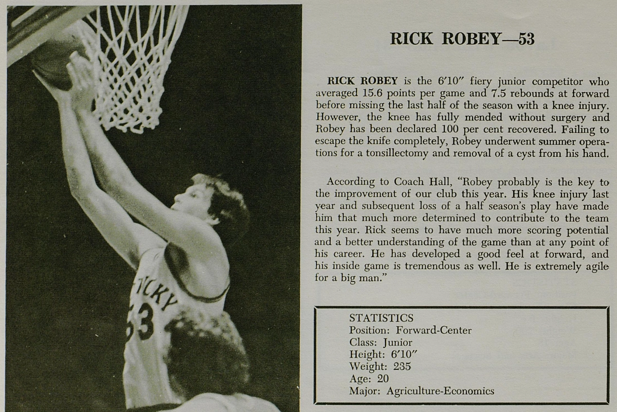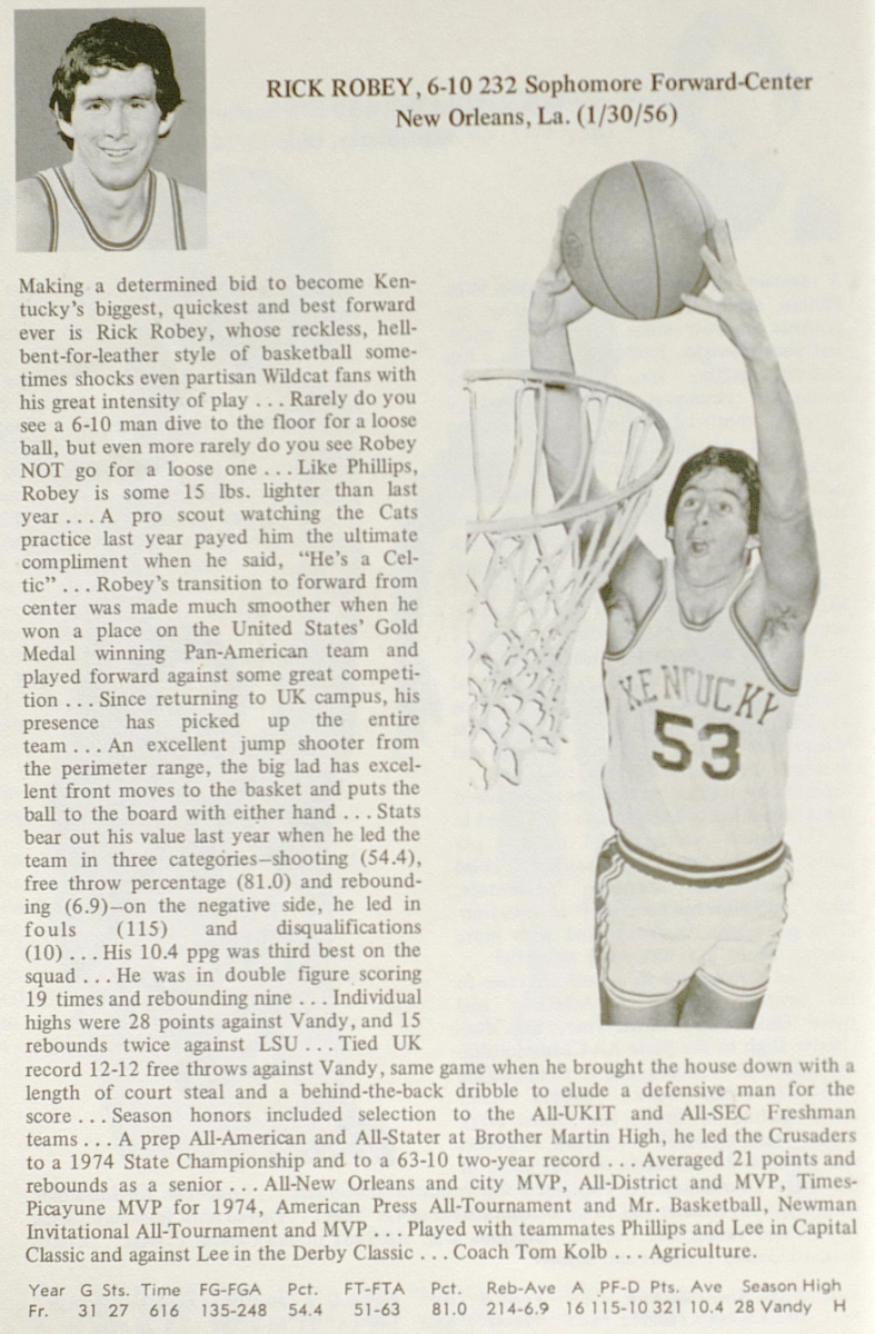 Coach Hall was pleased with Robey’s performance at UK saying “…Rick is not the kind of guy who pouts. He took the elbows, smiled and learned his lessons”.