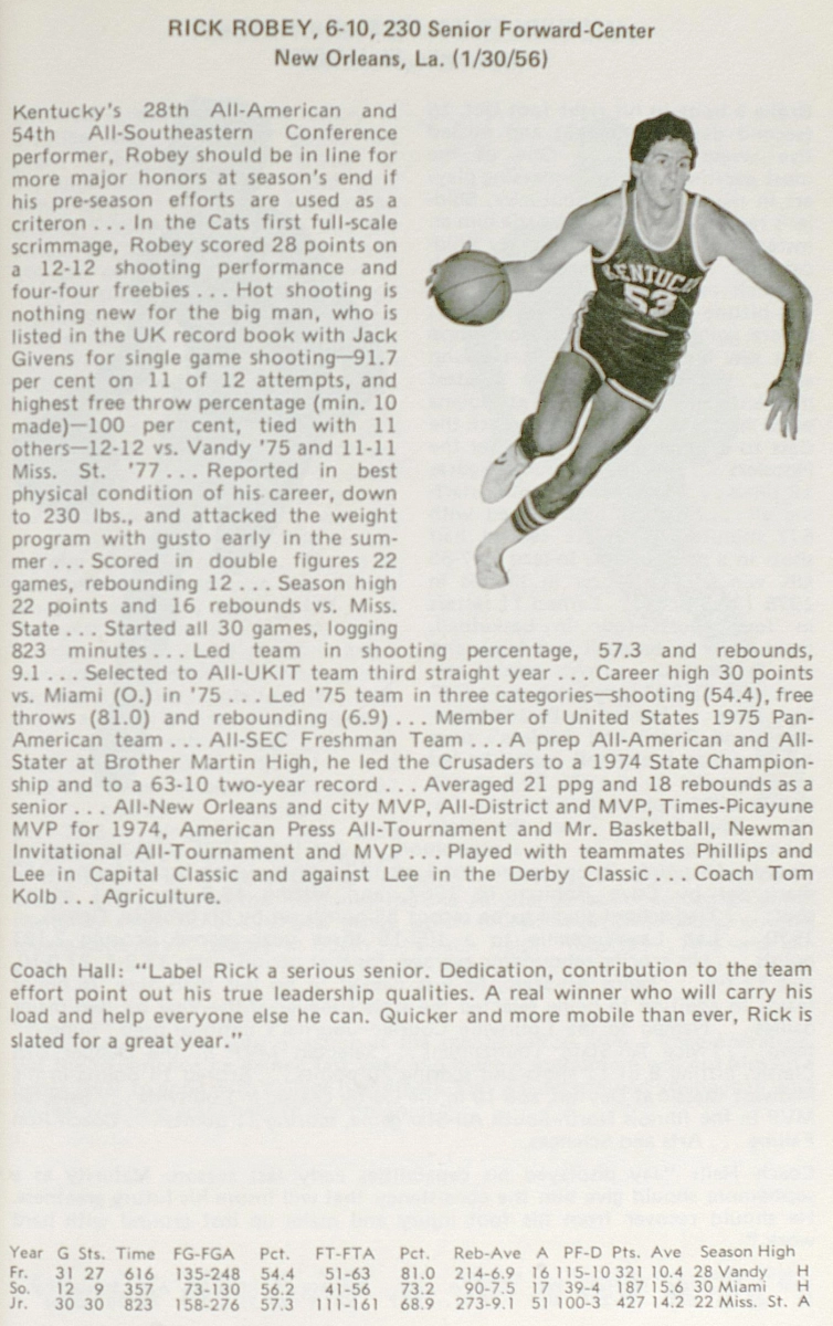 Rick Robey is celebrated for his contributions to Kentucky’s 1978 championship team and his role in the NBA. His legacy as a tough, skilled big man who excelled at both the college and professional levels continues to be remembered by Wildcats fans and basketball historians alike.