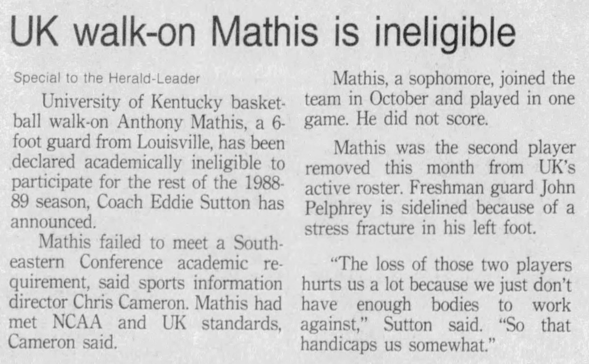 Mathis was declared academically ineligible for the spring semester of his freshman season. Mathis failed to meet a Southeastern Conference academic requirement, said sports information director Chris Cameron. Mathis had met NCAA and UK standards, Cameron said.